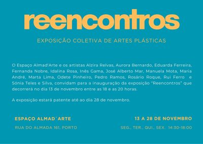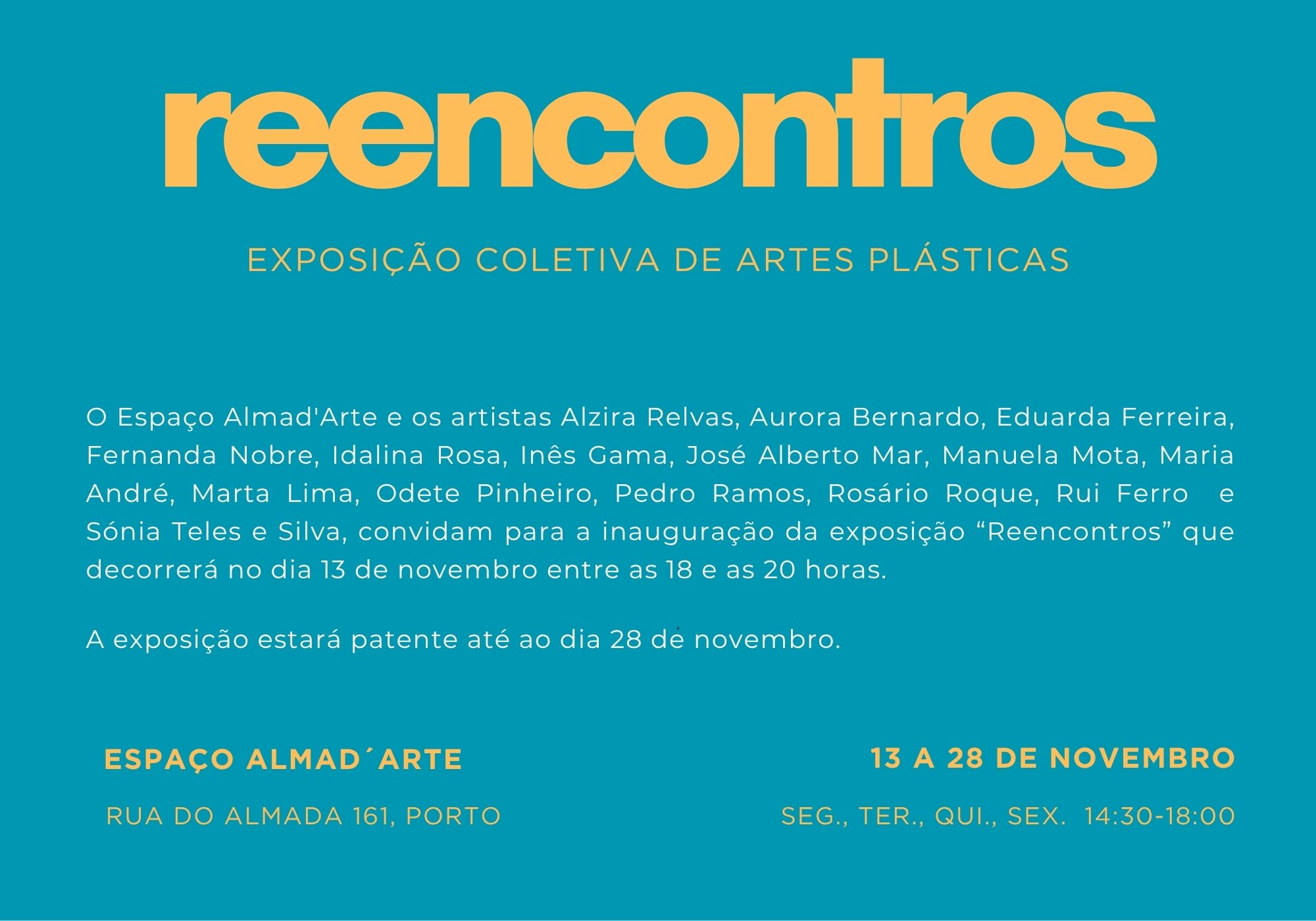 O Espaço AlmadArte, convidou quinze artistas plásticos que já aqui expuseram, para participarem numa Exposição Coletiva de final de ano, que decorrerá de 13 a 28 de Novembro. A intenção não é apresentar um discurso expositivo concetual, mas apenas provocar “Rreencontros” , numa época que cria predisposição emocional para esse “refrescar de laços”. Celebramos mais um ano de atividade, com alma e com Arte!